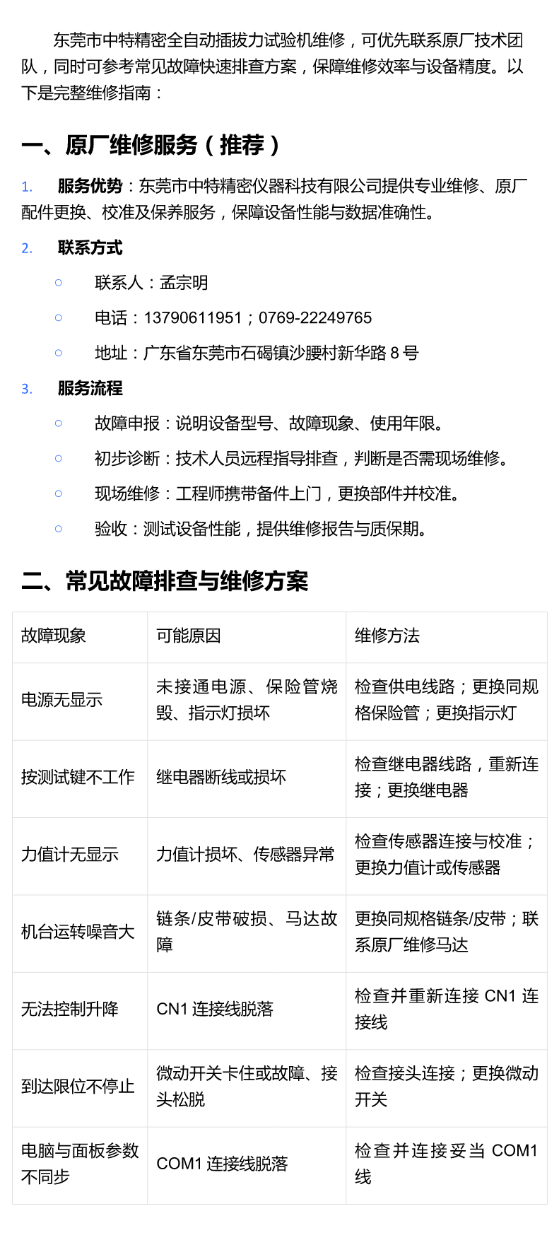 ​东莞市中特精密全自动插拔力试验机维修,可优先联系中特精密技术团队,同时可参考常见故障快速排查方案,保障维修效率与设备精度。​
