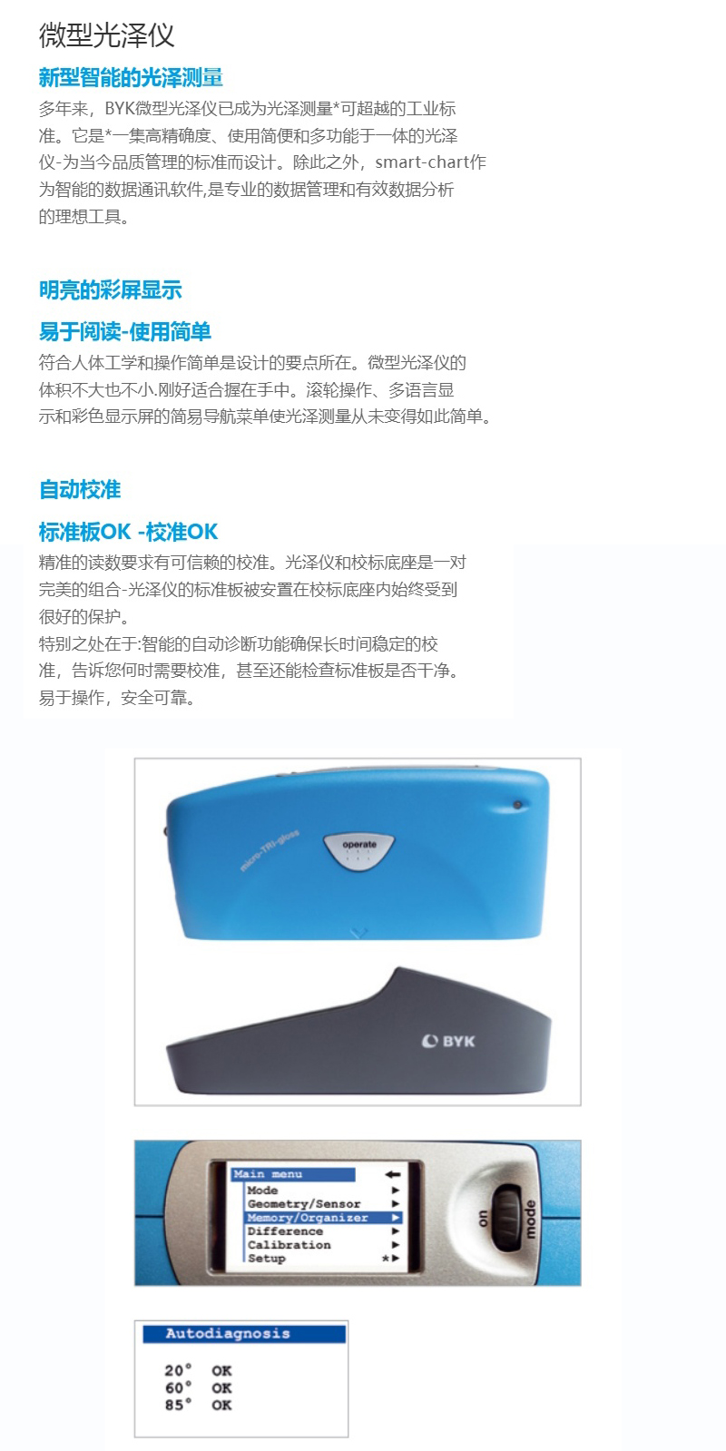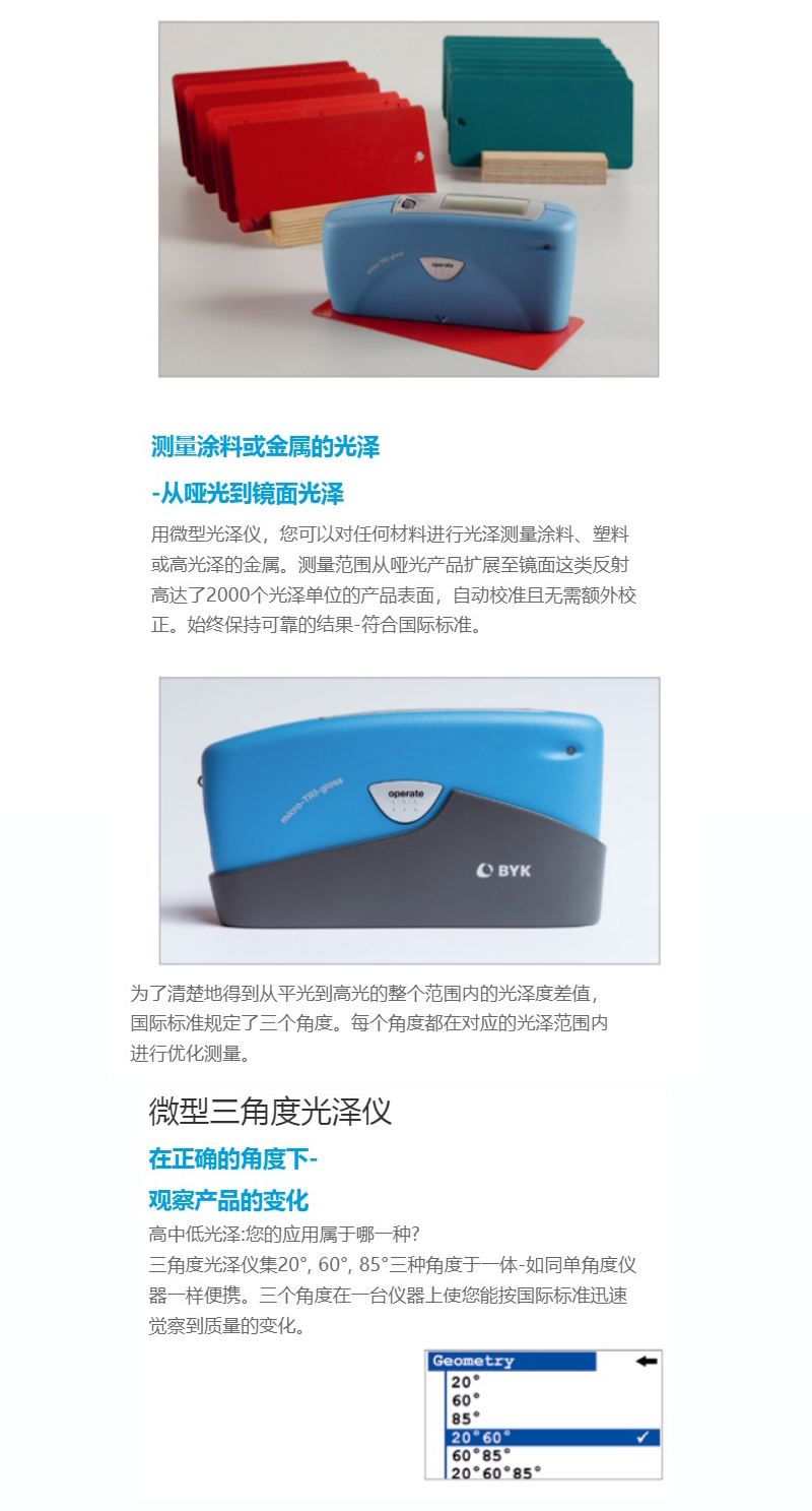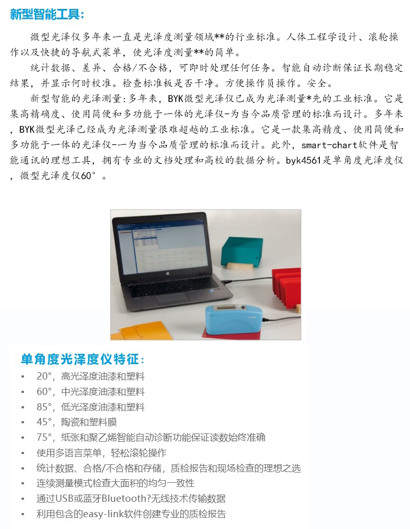 ​新型智能的光泽测量:多年来,BYK微型光泽仪已成为光泽测量领先的工业标准。它是集高精确度、使用简便和多功能于一体的光泽仪为当今品质管理的标准而设计