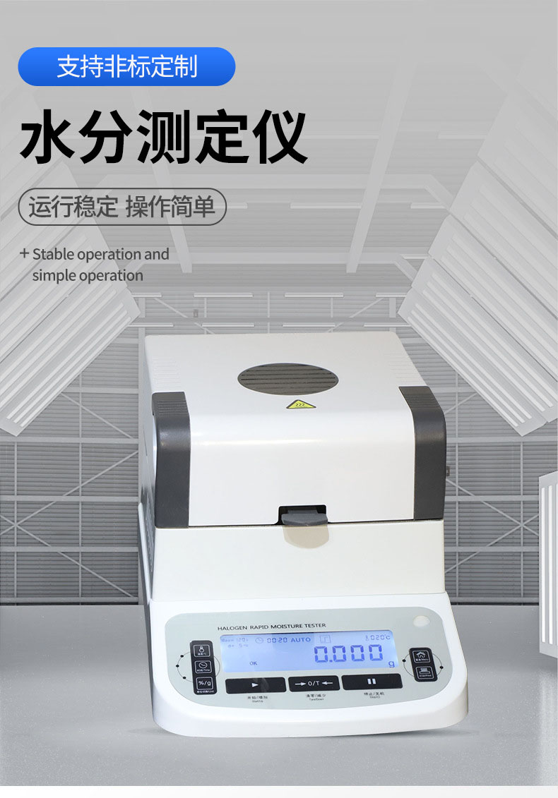 适用行业:广泛应用于粮食、饲料、烟草、造纸、食品(脱水蔬菜、肉类、面条、面粉、饼干、馅饼、水产加工)、茶叶、饮料、谷物、化工原料、制药原料、纺织原料等行业,对样品所含的游离水份进行测试。