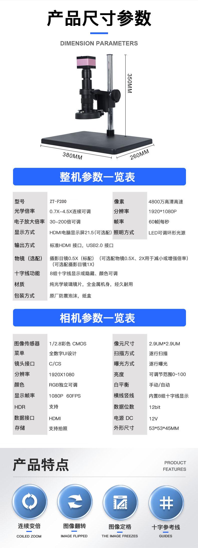 ZT-F200 是东莞中特精密生产的工业视频拍照显微镜,主打高清成像、连续变倍、一键拍照录像与测量,广泛用于电子、五金、珠宝等领域的精密检测与维修。