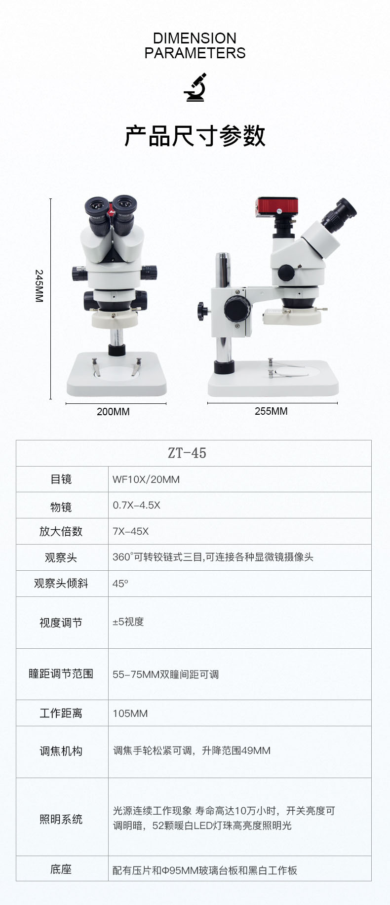 TZ-45是一款7–45× 连续变倍、三目、带视频输出的体视显微镜,核心用于工业检测、电子维修、精密装配与教学解剖。