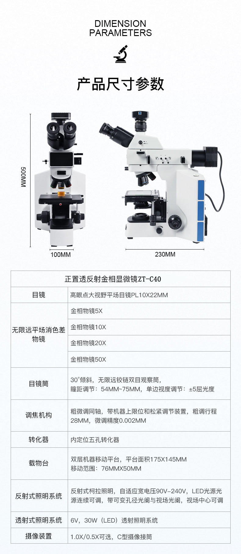 ZT-C40是中特精密出品的研究级透反射正置偏光金相显微镜,主打4K 超清成像、三目观察、偏光分析与测量功能,广泛用于金属、半导体、PCB、矿物、材料科研与工业检测。